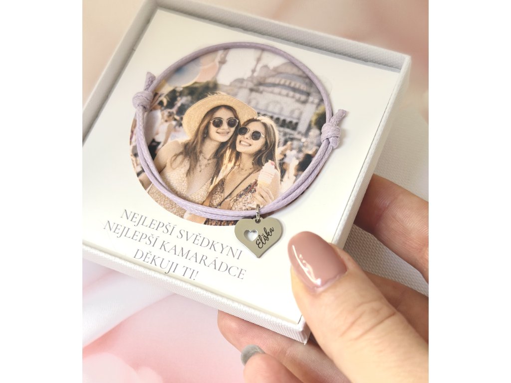 Součástí je kartička s tvojí fotografií a věnováním, díky čemuž se z náramku stává osobní dárek pro kamarádku, svědkyni, družičku, maminku s jedním dítětem nebo i pro radost sobě. Díky posuvným uzlíkům má univerzální velikost a dodává se v dárkové krabičce.