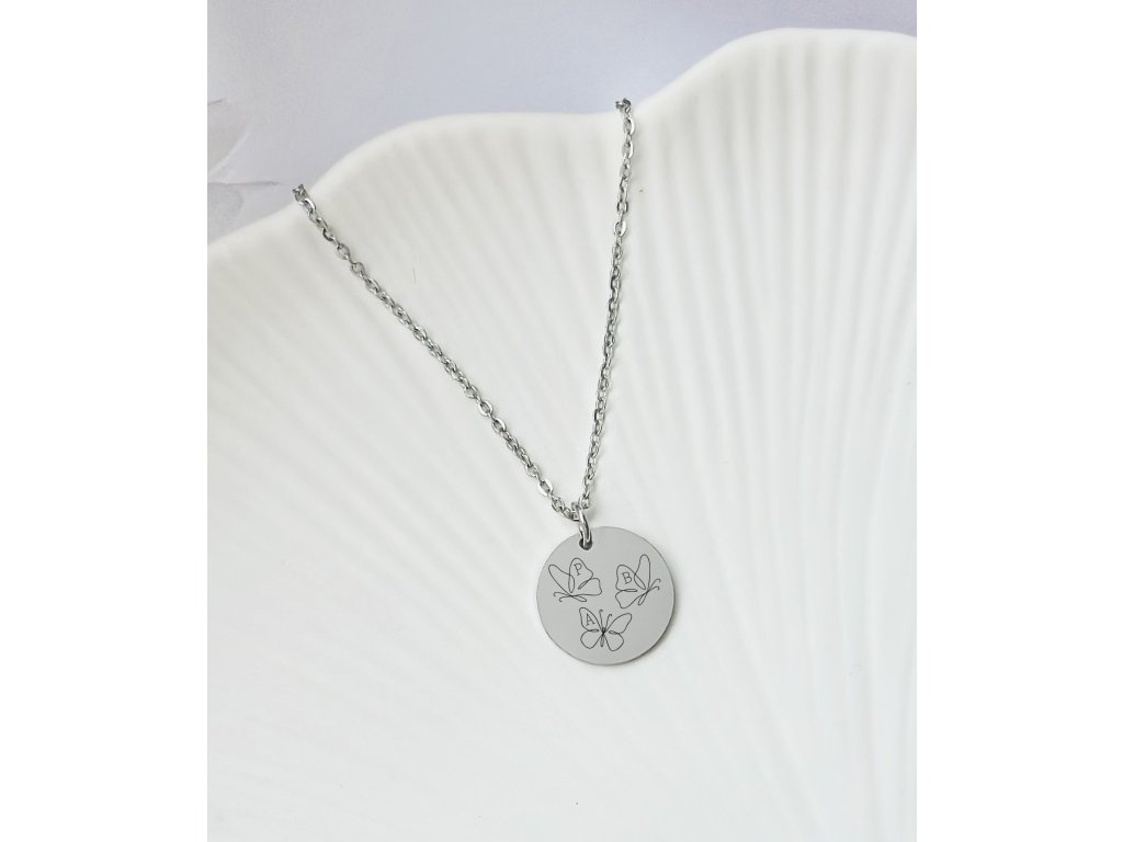 Elegantní náhrdelník s gravírovanými motýlky nesoucími iniciály dle vašeho přání. Ideální dárek pro maminky, babičky nebo kamarádky – šperk je zabalený v dárkové krabičce. Originální způsob, jak vyjádřit blízkost a radost z výjimečných okamžiků. Iniciály vložte zde do poznámky.